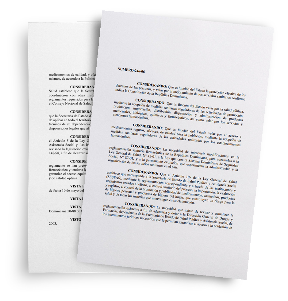 - Asesoría en legislación Farmacéutica (ley 42-01, Ley 87-01, Reglamento 246-06 y otros).